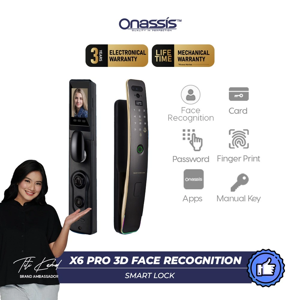 ONASSIS Smart Lock X6 PRO Face Recognition 3D Scanner mempunyai desain sangat keren dan canggih untuk smart lock di rumah Anda. X6 Pro dilengkapi spesifikasi tertinggi dari seluruh seri smart lock yang ada pada saat ini. Fitur andalan X6 PRO dibekali dengan sistem keamanan: built in camera viewer, fingerprint, password, card access, face recognition, dan manual key. Jadi dengan teknologi pengenalan wajah, user dapat membuka pintu secara otomatis menggunakan wajah saja!