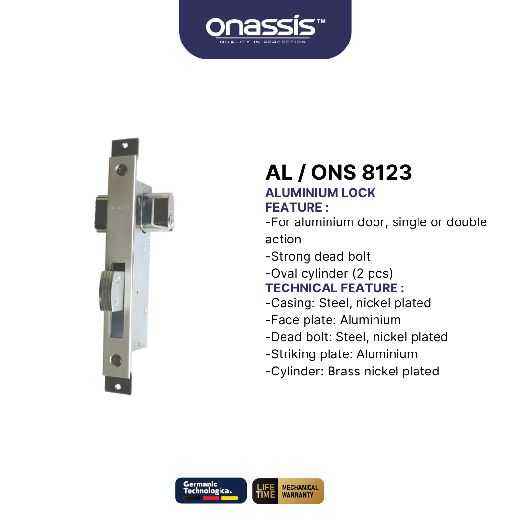Produk ini adalah bagian dari lini Aluminium Door Hardware Onassis yang terkenal akan inovasi dan ketahanannya dalam industri perangkat keras pintu. AL/ONS 8123 tidak hanya berfungsi sebagai perangkat pengaman, tetapi juga menambah nilai estetika pada pintu Anda.
