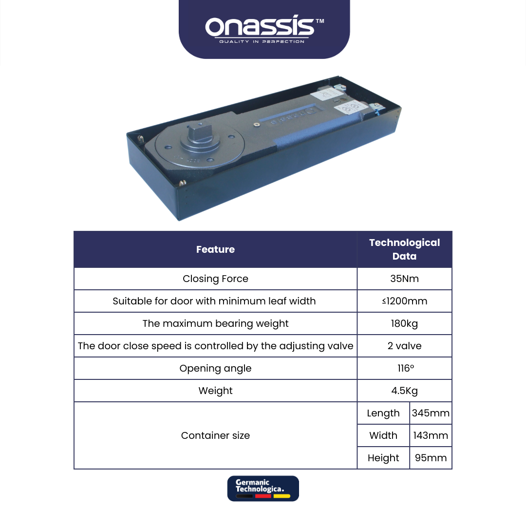 FS / ONS 90 HG adalah engsel lantai berkualitas tinggi dari Onassis, dirancang untuk memberikan performa optimal pada berbagai jenis pintu, termasuk pintu kaca dan kayu. Dengan teknologi canggih dan material unggulan, engsel ini memastikan pintu Anda beroperasi dengan lancar dan aman.