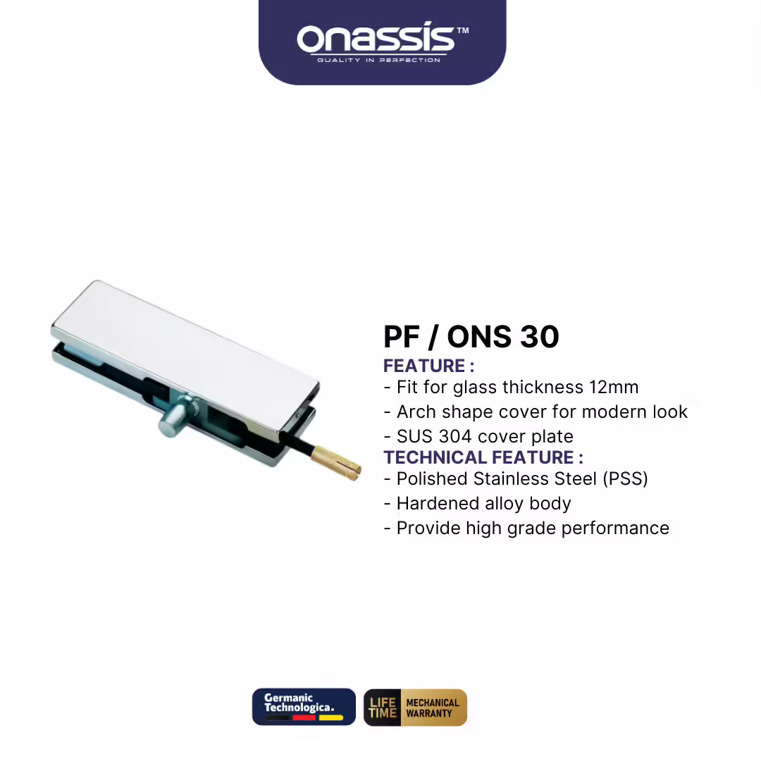 PF/ONS 30 adalah top patch fitting berkualitas tinggi yang dirancang khusus untuk pintu kaca frameless. Berfungsi sebagai penghubung antara bagian atas pintu kaca dengan frame atau struktur pendukung, komponen ini memastikan kestabilan dan keamanan dalam penggunaan pintu kaca tanpa bingkai.