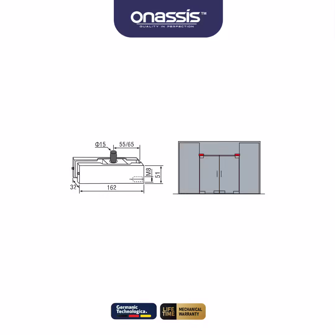 Dimensi Presisi: Memiliki ukuran 162 mm x 51 mm, PF/ONS 30 dirancang untuk kompatibilitas sempurna dengan berbagai ketebalan kaca, memastikan pemasangan yang mudah dan aman.