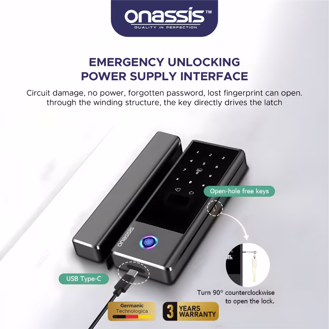 Ketika baterai Smartlock habis atau Anda melupakan metode buka kunci, Onassis memberikan manual key untuk membuka smartlock menggunakan tanpa memerlukan aliran listrik. Sehingga tidak perlu khawatir jika smartlock kehabisan baterai tiba-tiba.