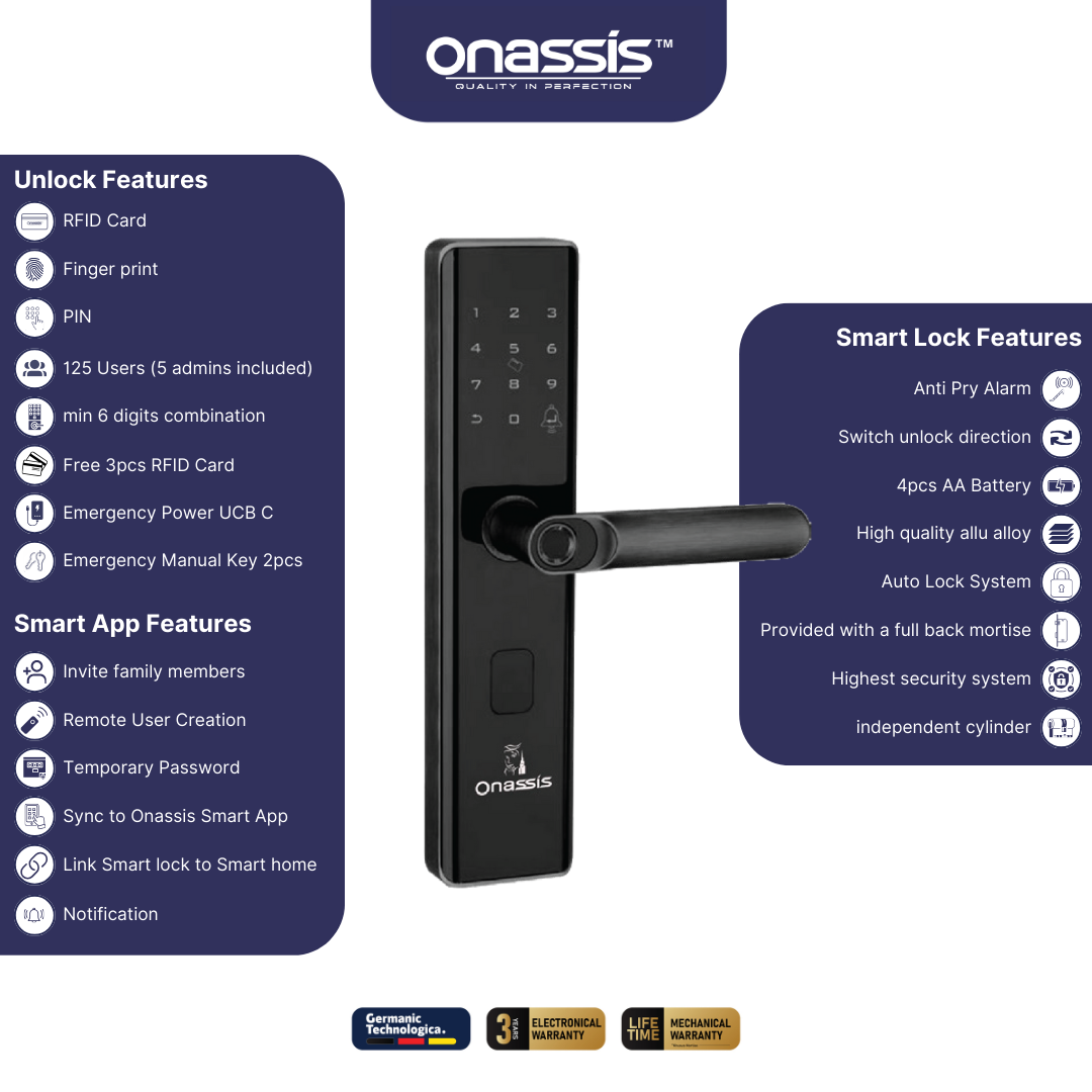 Fingerprint memastikan keamanan tinggi dengan proses identifikasi cepat, akurat dan tidak memerlukan kunci fisik atau kode akses. Anda dapat segera mendaftarakan fingerprint dengan mudah ke smartlock Onassis