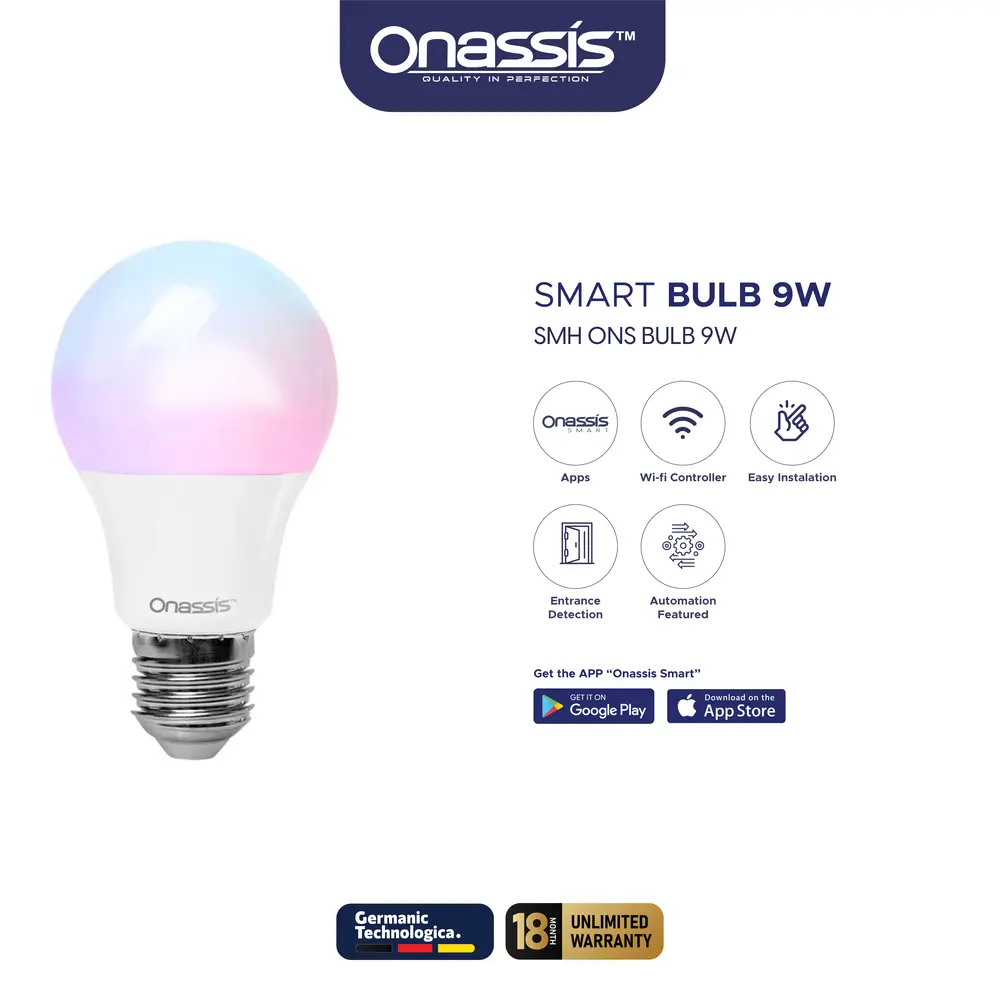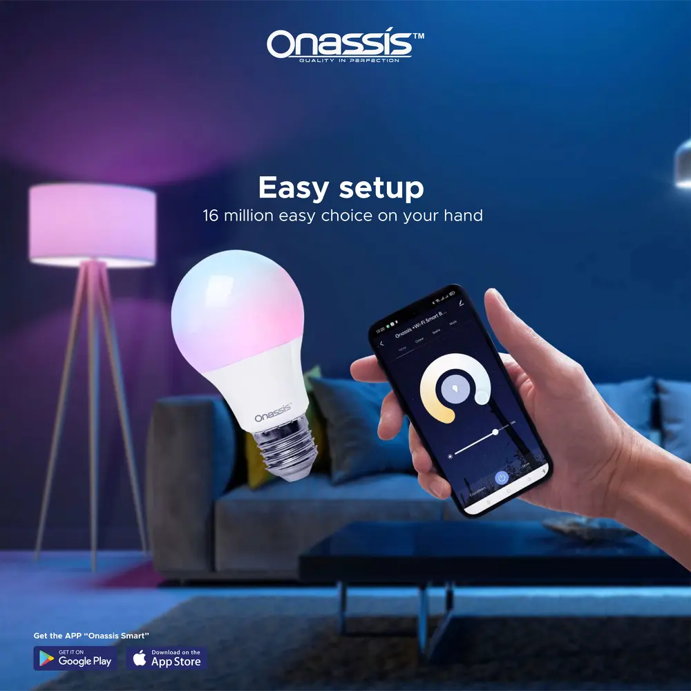Dengan Smart bulb 9W Onassis kamu dapat mengganti warna lampu sesuai dengan mood atau suasana ruanganmu. Kamu dapat menggantinya ke dalam 16 juta warna (CCT 2700K – 6500K) yang tersedia melalui 1 genggaman handphone. Bahkan Onassis memberikan opsi warm white dan cool white (2700 – 6500 kelvin) untuk melengkapi pilihan warnamu.