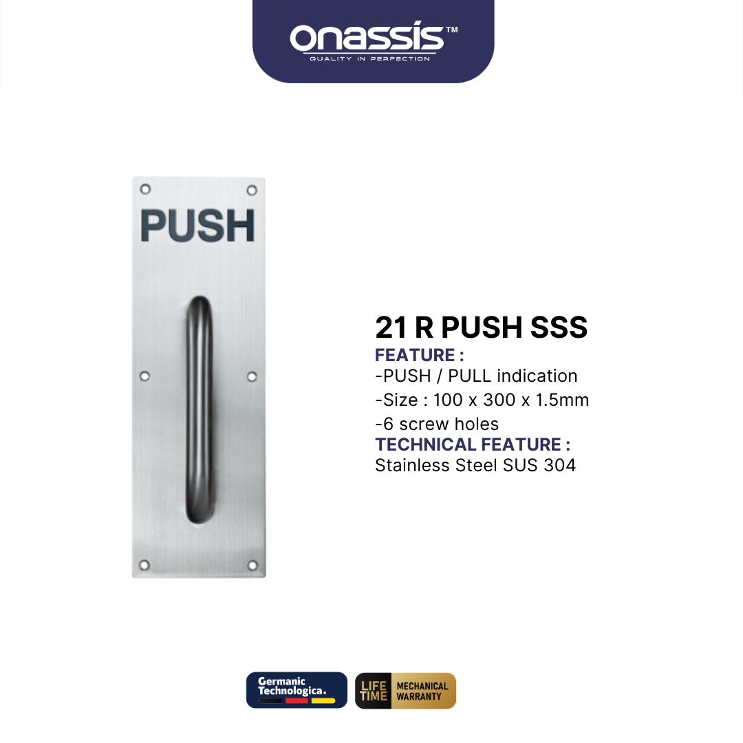 21 R PUSH SSS dari Onassis adalah handle pintu yang dirancang untuk memberikan kemudahan dalam mendorong pintu dengan gaya dan efisiensi. Terbuat dari stainless steel berkualitas tinggi, produk ini menawarkan daya tahan yang luar biasa terhadap korosi dan kerusakan. Sehingga ideal untuk penggunaan dalam jangka panjang di berbagai lingkungan.